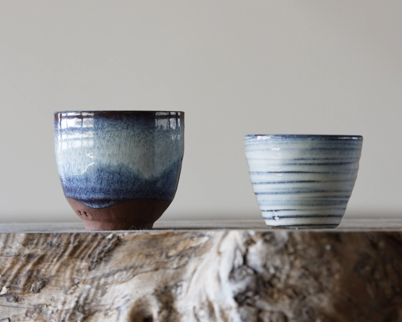 しかし、器として美しく、かつ機能的でなければ、「ただ土を使っただけ」では意味がありません。そのため、この土釉は3つの釉薬の中で最も数多くテストを繰り返しました。その執念の果てに訪れたのは、まったくの偶然による奇跡的な発見でした。なかま土に一定量の酸化鉄を加え、酸化炎で焼成したところ、ある一点で深い「群青色」が発現したのです。