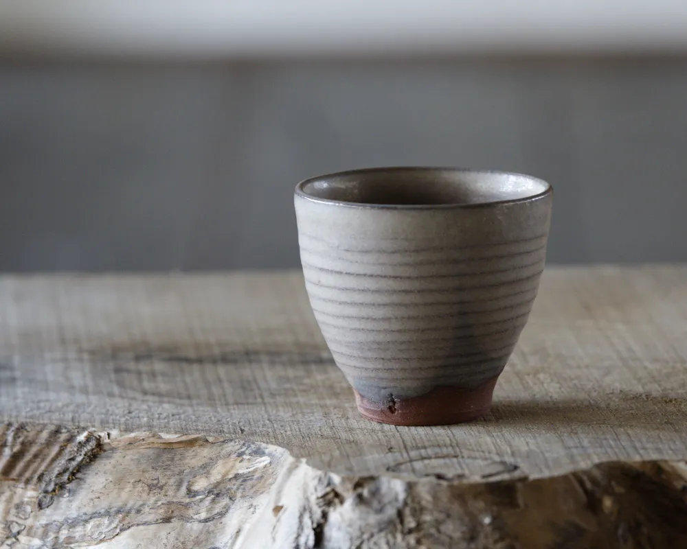 なかま土の素地に、この灰を化粧土として施し、さらに同じ灰を用いたマット釉で優しく包み込みました。決して均一ではない、赤土から透けるような白化粧の表情は、役目を終えた木が土へと還り、再び美しい道具へと生まれ変わった証です。